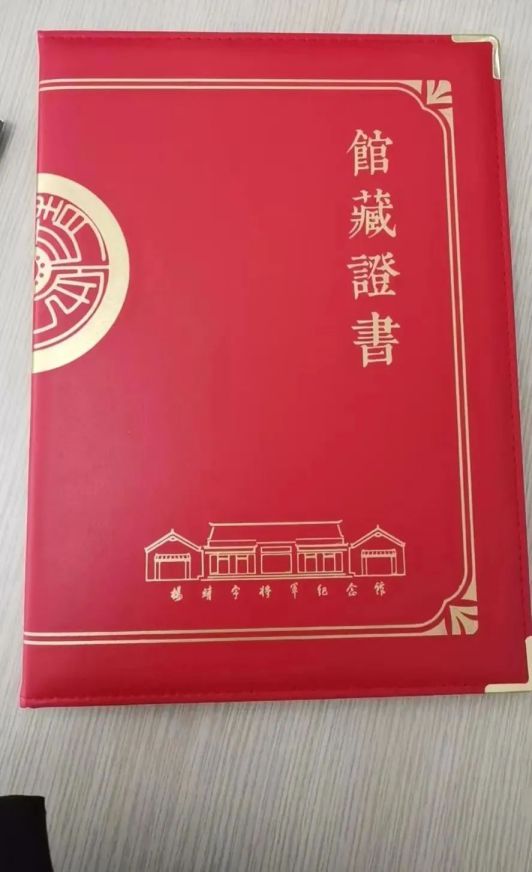 楊靖宇將軍紀念館為駐馬店市清澈商貿有限公司頒發的館藏證書