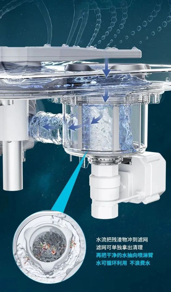 新型獨立過濾器,摒棄了傳統的濾網板設計,能夠有效防止食物殘渣殘留,輕輕旋轉上提即可取下清理,無需拆卸噴淋臂,日常清理更方便。