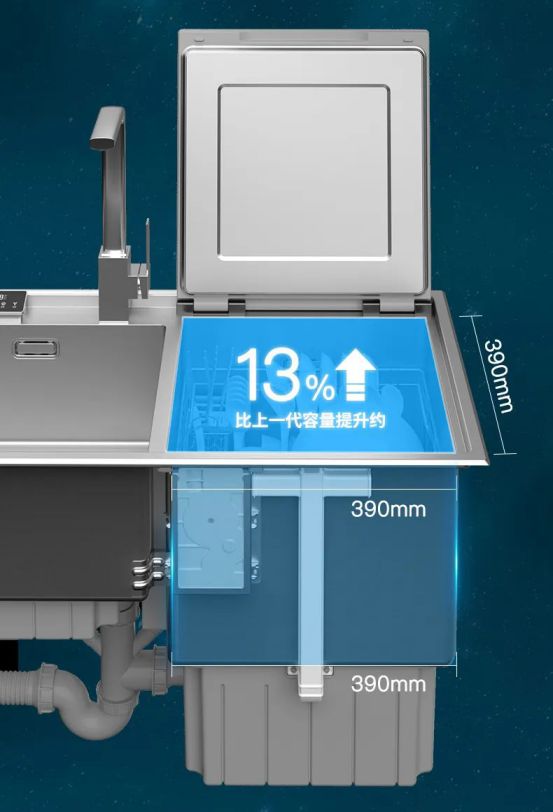 洗碗槽尺寸長寬均增加到390mm,總容量相比上一代提升約13%!并且水槽寬度也增加到了415mm,充分滿足各種洗刷需求。