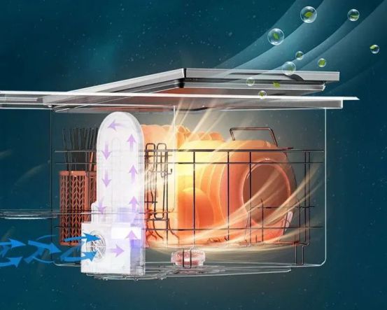 內置碟式速熱盤可以將水溫快速加熱至最高75℃,利用巴氏消毒原理,除菌率高達99.99%;清洗完成后,PTC強排風機帶動高溫熱風,經由獨特設計的下沉式風道,快速烘干餐具表面水分,防止細菌滋生;進風道內置UVC深紫外消毒模塊,對進入洗碗腔的空氣進行消毒,從源頭上杜絕烘干過程中的二次污染風險。