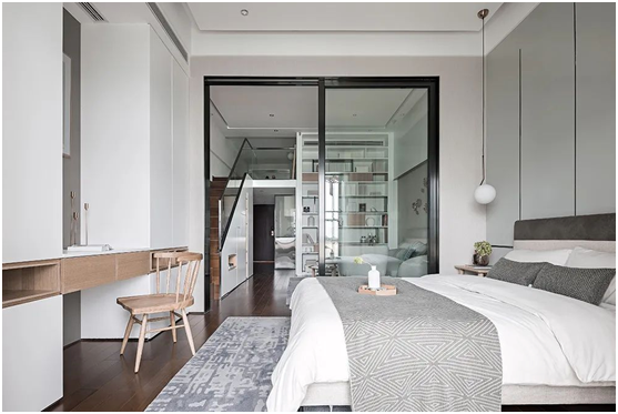 接下來我們移步到臥室。臥室與客廳僅僅隔著玻璃推拉門,通透地把采光貫穿了整個空間,顯得通透而有私密性;臥室床尾處還設置了書桌、衣柜,提升了空間的實用率。