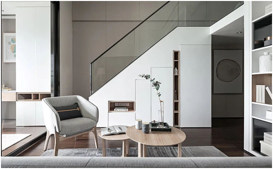 沙發對面的電視墻被簡鉆家居巧妙設計為樓梯,后方空間都做成收納柜,樓梯、收納兩不誤,保持簡潔大方的基礎,又提升了空間的儲物功能。而沙發旁邊的墻面做成書架,擺上書籍、陶藝品和金屬擺件,提升了空間的藝術與精致感。