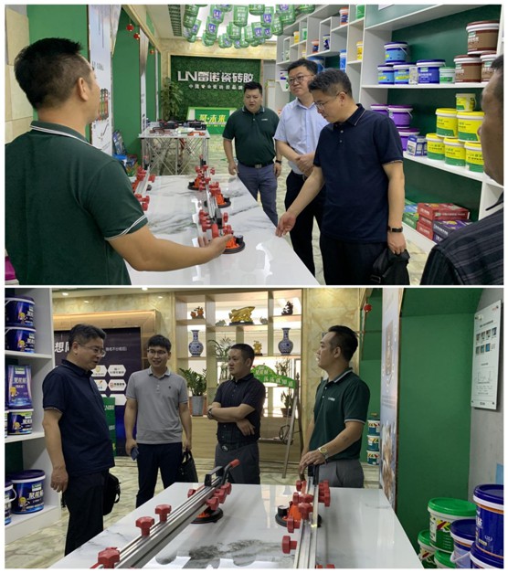 在企業(yè)高層領(lǐng)導(dǎo)的引導(dǎo)下,馮董和李局首先參觀了雷諾產(chǎn)品展示廳,雷諾企業(yè)歷程、規(guī)模實(shí)力以及各類雷諾臻品依次映入眼簾,雄厚的品牌底蘊(yùn)和至臻至美的產(chǎn)品無一不展現(xiàn)著雷諾的企業(yè)實(shí)力和匠心精神。其中,鄧總向來賓們特別介紹2022年新品——雷諾聚能貼。新品在配方上全新升級(jí),實(shí)現(xiàn)界面處理、瓷磚背膠、墻面防水三效合一,粘力更強(qiáng),性能更優(yōu),耐久更安全,可質(zhì)保50年。在目睹雷諾聚能貼的實(shí)際效果后,各位領(lǐng)導(dǎo)紛紛對(duì)雷諾新品給予高度的評(píng)價(jià)。