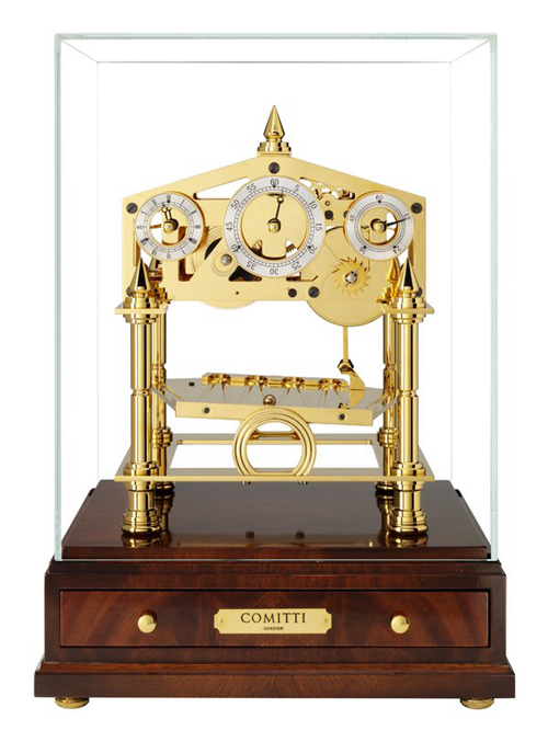 富麗堂皇的桃花心木底座之上,水晶透明斜邊玻璃罩之中,是璀璨奪目而不落俗套的走珠鐘主體:手工打造全黃銅24K鍍金機芯,機械鐘界“超小”鐘面與其他齒輪零部件融為一體,似乎在宣告自己戰火中出生的傳奇身世,豈是那些安居于民宅的普通機械鐘可比。