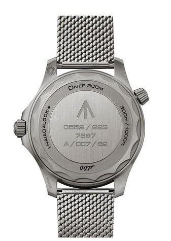 ▲歐米茄海馬潛水300米系列同軸擒縱42毫米大師天文臺007版腕表,搭配鈦金屬表煉,底蓋鐫刻軍隊配發腕表所編列的數字。