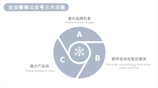 企業首先應該明確的一點是:微信公眾號是移動時代的企業官網。在PC時代,一個企業需要有自己的官方網站來展示自身實力和形象,一個連官網都沒有的企業在消費者看來是不值得信任的;而在移動時代,公眾號承接了官網的功能。企業需要通過公眾號展示品牌形象、展示產品線、提供咨詢和售后服務功能。這才是企業公眾號最應該承擔的角色,它是企業的品牌大使。