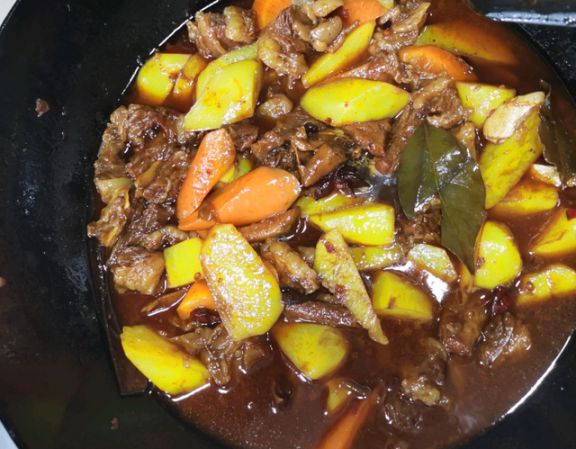 第六步、加入土豆塊,繼續燉半小時。加入適量鹽調味,大火收汁,湯汁濃稠后即可出鍋。如果想用湯汁泡飯,可以多留點湯。