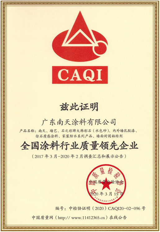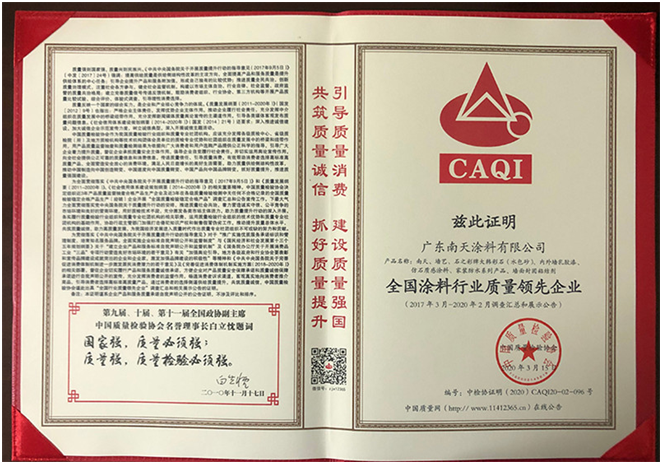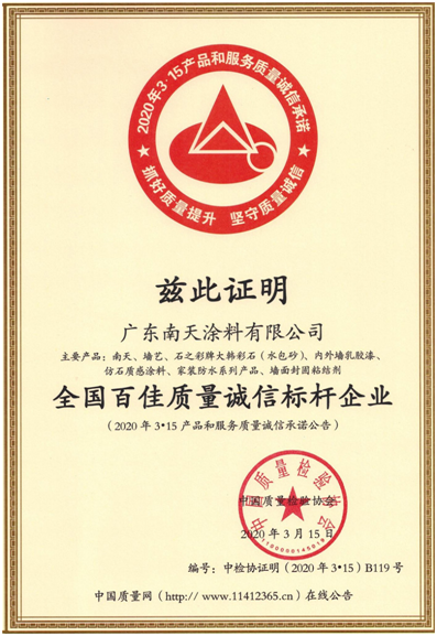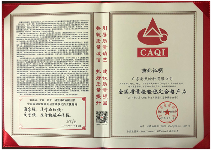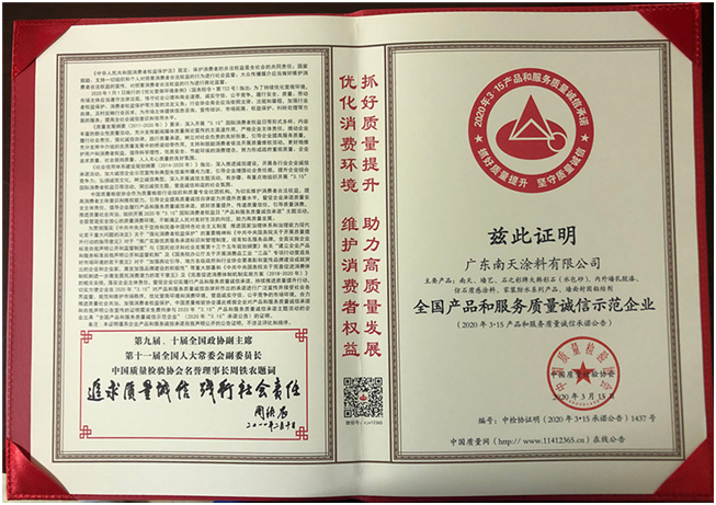 2020年3月15日,在“3.15”國際消費者權益日,廣東南天涂料有限公司憑借可靠的產(chǎn)品質量、完善的售后服務和良好的品牌口碑,一舉斬獲由中國質量檢驗協(xié)會頒發(fā)的“全國產(chǎn)品和服務質量誠信示范企業(yè)”、“全國百佳質量誠信標桿企業(yè)”、“全國涂料行業(yè)質量信領先企業(yè)”、“全國質量檢驗穩(wěn)定合格產(chǎn)品”等多項榮譽稱號。