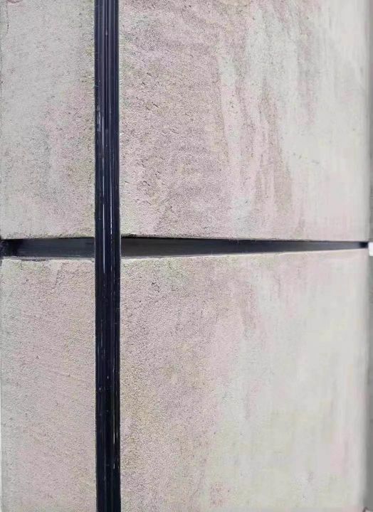 外墻粗底膩子及白膠施工:在水中緩慢加入粗底膩子和白膠,攪拌成均勻的漿料,墻面先用粗底膩子批刮一遍,待干燥后,進行分格,在分隔條上打上免釘膠固定深槽材料(提示:基面不得有浮灰、油污其他污染物、其墻面的含水量應小于10%。漿料應即配即用,配制好的漿料需在4小時內用完,不得二次加水)。