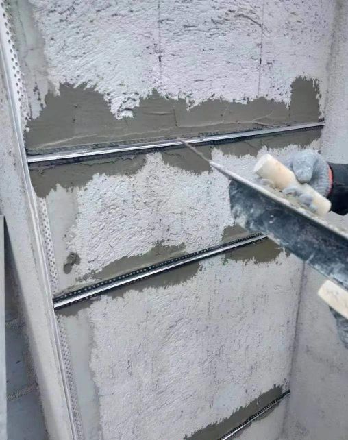 固定好分隔條之后,批刮第二遍外墻抗裂砂漿,干燥后再批刮外墻專用細膩子(找平),厚度需與線條齊高。
