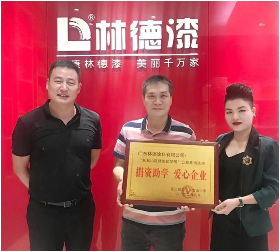 林德漆一直堅持生產優質的綠色友好型產品,積極走出一條特色的品牌塑造之路,倡導綠色低碳家居,用心為消費者營造健康環保的生活空間。此次林德漆參與的“托起三區師生的夢想”公益募捐活動,深獲社會各界的認可與稱贊,獲得了“捐資助學,愛心企業”稱號。