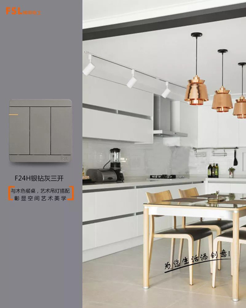 廚房處,F(xiàn)24銀鉆灰開關(guān)與室內(nèi)空間中的原木餐桌,富有藝術(shù)感的吊燈,看似簡單,實則在細節(jié)處彰顯空間藝術(shù)美學(xué)。