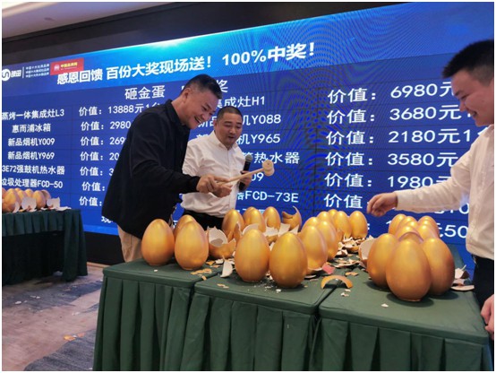 亮點滿滿的優惠政策一經公布,再次將現場的熱烈氣氛推向新高度。透過經銷商發自內心的肯定與滿臉的喜悅之情,我們能看出眾人心中已經有了要下單訂貨的強烈欲望,這也正為接下來的下單打款環節奠定下基礎。而為感恩各位經銷商的下單支持,銀田還特意準備了砸金蛋環節,將集成灶、煙機、熱水器等豪華大禮傾情相送。