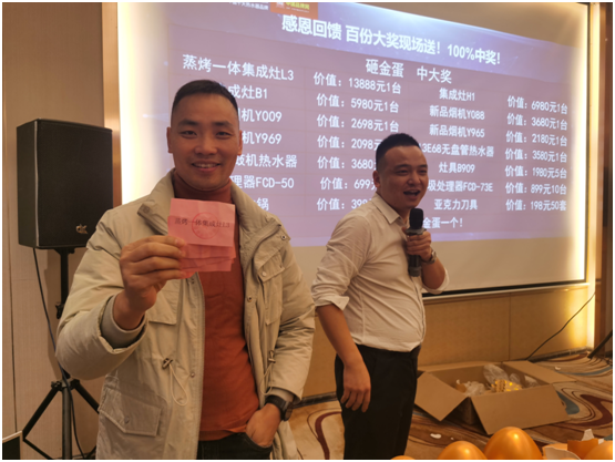 優惠政策,終端支持,助力銷售!感恩回饋激烈方案一經公布,便得到現場經銷商的一致熱烈反響。在主持人宣布下單訂貨環節開始時,全場經銷商都爭先恐后地涌向合作簽約臺,勢要為自家終端門店帶回更全面多樣的靚麗新品。而為了回應經銷商們的熱烈支持,銀田總部亦特別為大家準備了驚喜滿滿的砸金蛋環節,以集成灶、煙機、熱水器等豪華大禮相贈,力保經銷商家人們都能在本次會議中“滿載而歸”!