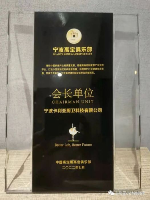 卡利亞作為不銹鋼高定品牌,憑借強勁的品牌實力和影響力,此次受邀出席并授予“寧波高定俱樂部會長單位”榮譽資質,為推動寧波高定行業及不銹鋼定制家居行業貢獻自己的力量。