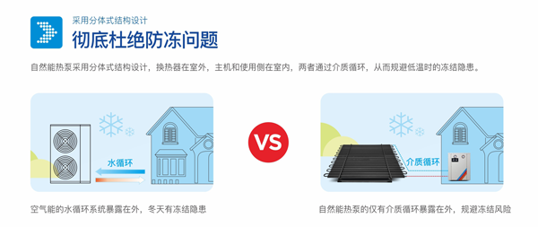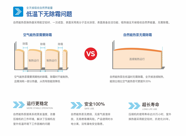 空氣源在低溫工況運行一段時間,結(jié)霜、除霜不能持續(xù)供應(yīng)熱能,結(jié)果影響室內(nèi)溫度,自然能可在低溫惡劣環(huán)境機組持續(xù)熱能供給,在低溫惡劣環(huán)境下可以保證室內(nèi)溫度。