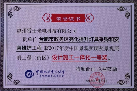雷士照明"合肥市政務區亮化提升燈具采購和安裝維護工程”獲2017年度中國景觀照明獎景觀照明工程(街區)設計施工一體化一等獎