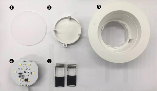 1.擴散板 2.后蓋 3.殼體 4.光源模組 5.卡簧