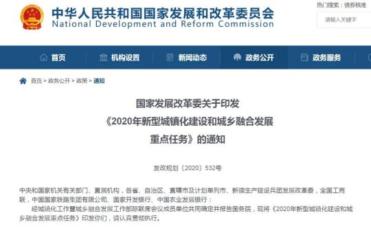 ▲國家發展改革委關于印發《2020年新型城鎮化建設和城鄉融合發展重點任務》的通知。