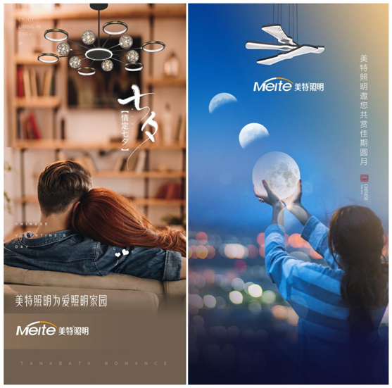 與全品類現貨營銷平臺搭配的,還有貼合消費者的品牌營銷引流。美特照明開辟“小號”,以年輕化的語言與千禧一代對話,推出節日場景化海報以及推文,打造出不同消費人群的實際場景,展現出美特照明帶給人們的生活小確幸,無縫融合年輕一代的時尚生活。
