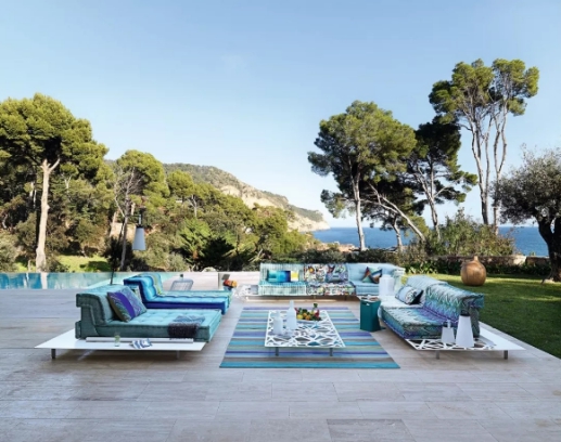 戶外家具格外受寵,功能方面人性化升級,速干、防水、防曬、鎖色……2019年春夏上新的戶外版本 MAH JONG(麻將沙發),使用頂級針織品牌MISSONI HOME的專供防水面料,內部填充最新研發的快干泡棉,超越傳統泡棉的三倍速度的瀝干能力。每一模塊麻將沙發有合身的保護罩,暴雨等惡劣天氣也不用擔心家具的損耗問題。配套的金屬支架可以固定沙發,涂漆防腐防銹,座位兩側的托盤可存放墨鏡、毛巾或防曬霜。