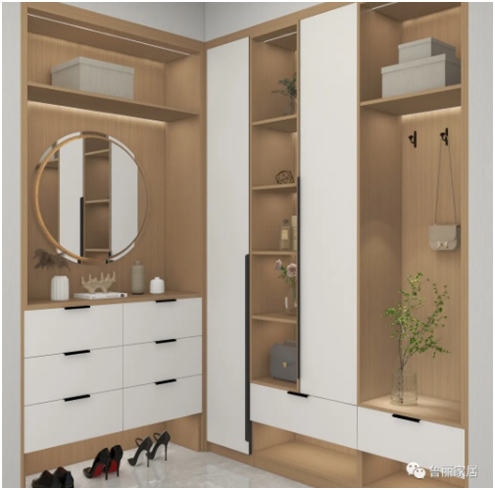 中間的開放格可以存放自己喜愛的包包、飾品等,也可以放上自己喜歡的藝術品,為整個空間增添更多的藝術氣息。
