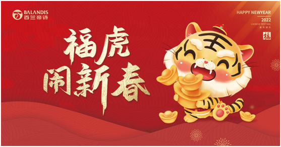時光荏苒,歲月流金。我們一同走過了風云變幻的辛丑年,迎來了充滿希望的壬寅年。在這辭舊迎新的時刻,百蘭帝詩家居全體同仁向一直以來始終支持與陪伴百蘭帝詩成長的廣大經銷商、合作伙伴及消費者朋友們,送上誠摯的問候與新春的祝福:祝大家在新的一年里,工作順利,事業有成,蒸蒸日上,虎年“虎”起來!