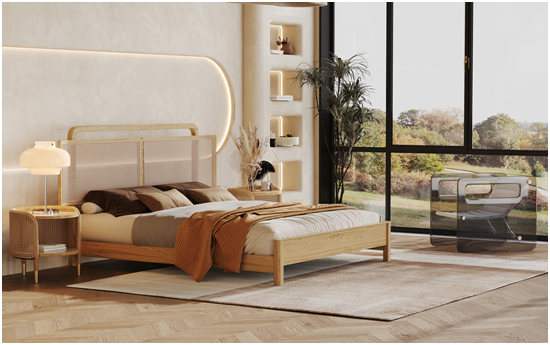 藤木工藝結合的極簡大床滿載著溫柔與舒適,將時尚與古典兼容,散發著純天然植物特有的光澤,為家居生活平添了幾分淡泊和從容。