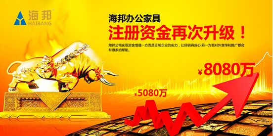 眾所周知,一家有實(shí)力的企業(yè),外在注冊(cè)資金的多少,內(nèi)在產(chǎn)品的質(zhì)量,決定企業(yè)未來的發(fā)展方面。作為中國著名辦公家具品牌海邦原來的注冊(cè)資金就有5080萬元,在行業(yè)中已屬于佼佼者。當(dāng)下,注冊(cè)資金又升級(jí)到8080萬元,如此大手筆的操作,更是令其他同行“望塵莫及”、敬而生畏。