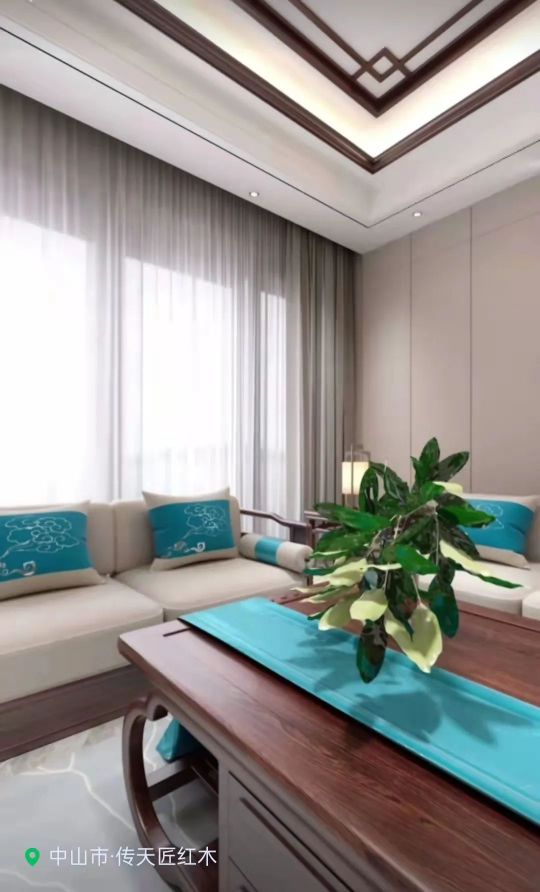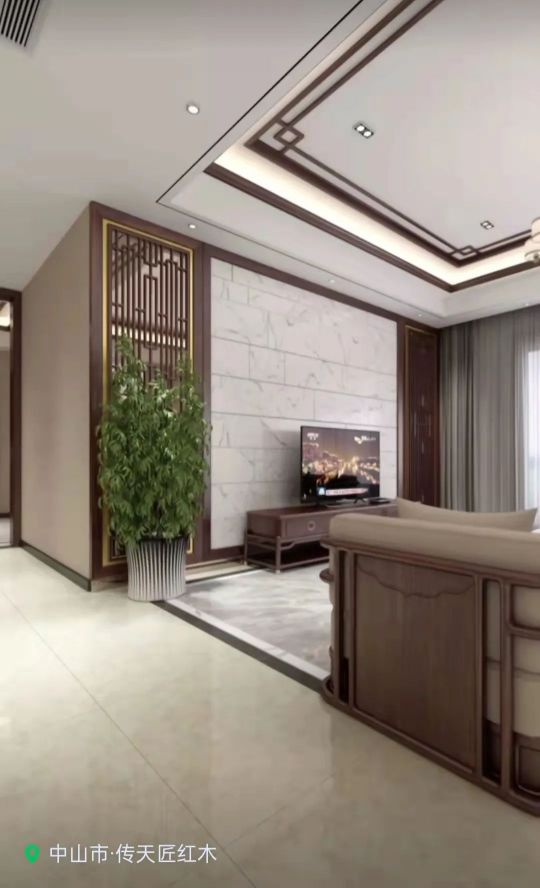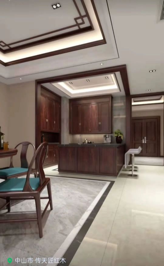 利用簡約的紅木線條將天花勾勒出來,毫不復雜的設計相當輕快,打破紅木整裝傳統的厚重印象。