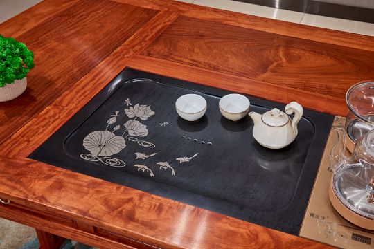 茶臺設計為濕泡臺,茶盤處使用烏金石面板,不生異味、不易沾茶垢,同時也對茶臺起到點綴的作用。