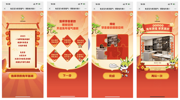 另一方面,兔寶寶在微博等社交平臺順勢開啟#找兔寶寶,為家添福氣#的話題場域,通過互動H5,將兔寶寶家居產品與家居“福氣煥新”相結合,一面滲透話題,加深消費者對“兔寶寶,讓家更好”品牌理念的感知;一面激發種草購買力,有效縮短了用戶的選購流程。