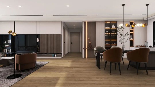 全屋通鋪木地板,不僅將木材的原生紋理與質感展現得淋漓盡致,更以無限延伸的空間感,營造出通透自在的生活圖景。