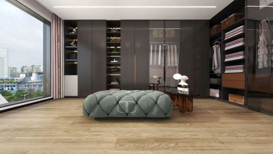 淺棕色木地板搭配整墻木衣柜,極盡木材的本色,既有一種歲月磨礪過的成熟,又流露出對純真自然世界的向往。