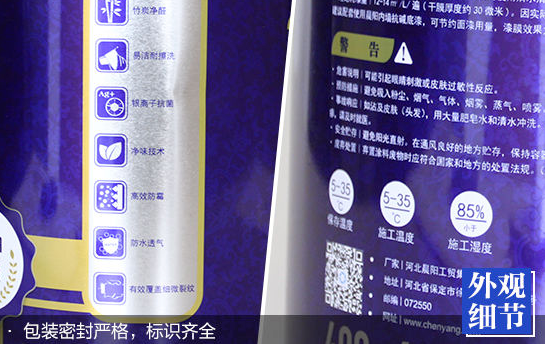 外包裝上清晰地印有產(chǎn)品的工藝、使用、保存和施工條件。通過(guò)包裝,我們可以詳細(xì)了解水性漆的操作方式和注意事項(xiàng)。可以看出,水性漆具有竹炭網(wǎng)醛、銀離子抗菌、易清洗、耐擦洗等一系列使用特性。