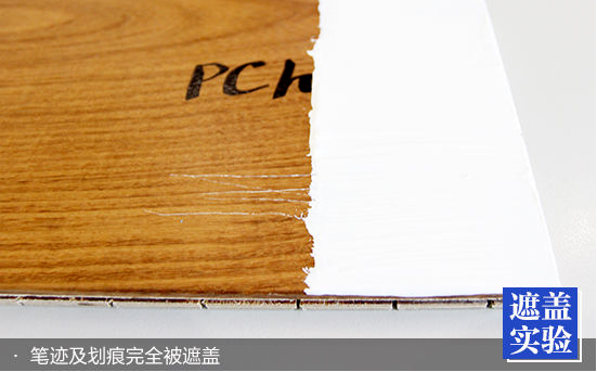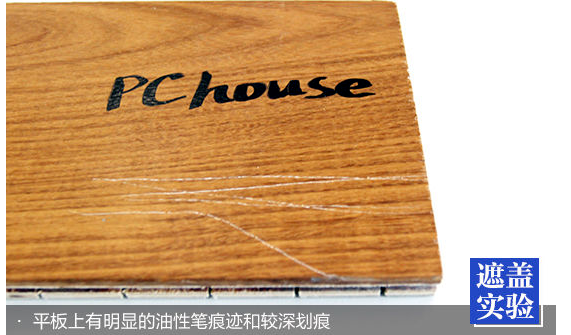 我們用油性筆在黑板上寫(xiě)下了“PChouse”這個(gè)詞。與此同時(shí),在用刀劃了幾道深深的劃痕后,我們拿了晨陽(yáng)水漆畫(huà)了一半。可以看出,干燥后,涂刷過(guò)的黑色字體和劃痕明顯被完全覆蓋,劃痕處沒(méi)有涂料凹陷的痕跡,漆膜整體厚度均勻,涂刷平滑,覆蓋力明顯。