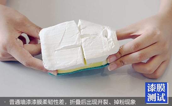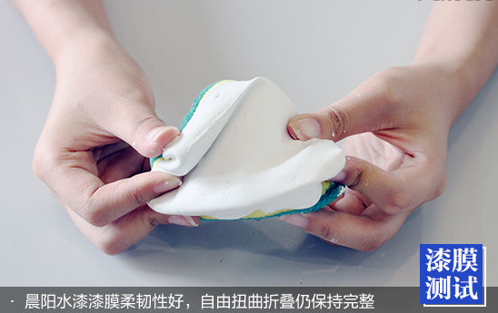 我們將兩塊完全相同的海綿分別浸泡在晨陽(yáng)水漆和普通墻漆中,待漆膜干燥后,折疊并扭轉(zhuǎn)海綿。
