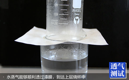 我們?cè)诩埍∧さ谋砻嫱可铣筷?yáng)水性漆,干燥后制成漆膜,用沸水覆蓋在玻璃上,然后倒置扣上一個(gè)透明的干燥燒杯。一段時(shí)間后,可以看到上燒杯出現(xiàn)霧,水滴明顯凝結(jié),表明下部水蒸氣通過(guò)紙膜到達(dá)上燒杯,膜具有較好的透水性和透氣性。