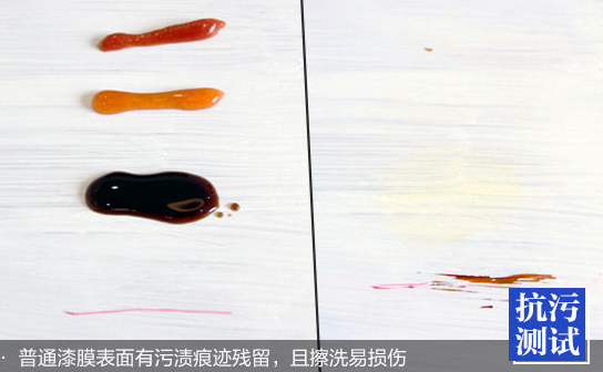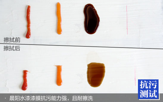 可以看出,涂有晨陽(yáng)水性漆的漆膜擦拭后保持完好,無(wú)需太多努力就可以將調(diào)味品和筆跡完全擦掉,而普通的漆膜清洗需要很大的努力,深色醬油在漆膜表面留下淺色的痕跡,而水性筆痕由于需要?jiǎng)×也料炊杆倜撀洌瑢?dǎo)致漆膜明顯損壞。晨陽(yáng)水漆比普通墻面涂料具有更高的耐沾污性和耐擦洗性。