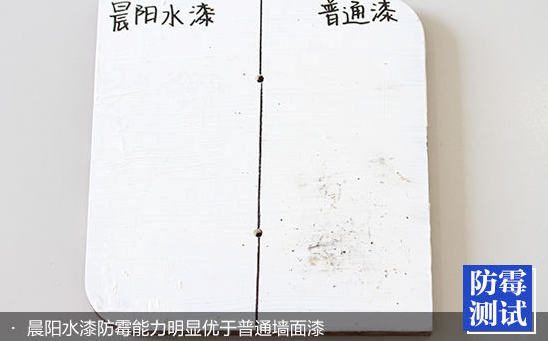 在未上漆的木板的左側(cè)涂有晨陽(yáng)水漆,右側(cè)涂有普通墻面面漆。在漆板表面噴水后,左側(cè)晨陽(yáng)水漆的漆膜仍然干凈明亮,可見(jiàn)霉斑少,而右側(cè)普通漆膜表面出現(xiàn)少量霉斑,漆膜具有優(yōu)異的防霉性能。