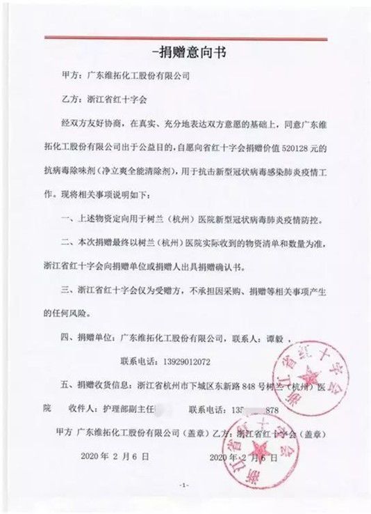 日前,廣東維拓化工股份有限公司(以下簡稱“維拓水漆”)聯系了紅十字會,向樹蘭(杭州)醫院捐贈了一批超過50萬的抗病毒產品,用于抗擊新型冠狀病毒感染肺炎疫情工作,為身處在一線的防疫治疫工作人員提供了珍貴的醫用物資。