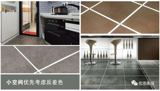 小空間指廚房、衛生間,地面磚都是選尺寸相對較小的,這是為了讓地面劃分多塊,增加空間的開闊與大氣感,反差色能夠刺激眼球,凸顯瓷磚縫隙視覺感,這樣的搭配使瓷磚之間的線條錯落有致。因此小空間的美縫選擇與地磚反差的顏色。例如黑色瓷磚就采用瓷白色的美縫劑。