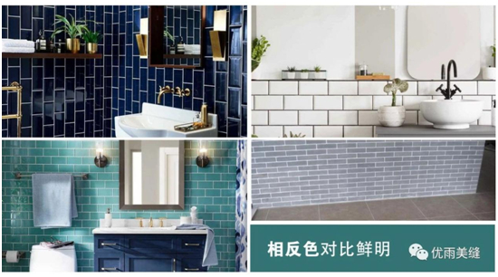 如果想要達到一種震撼的效果,那么使用對比鮮明的反差色是必需的。比如冷色與暖色、亮色與暗色,應用到美縫上就如:黑磚白縫、黃磚藍縫等,強烈的反差色會特別刺激眼球,增強整體空間的裝飾效果,使空間更加美觀。相反色主要用于展示廳、商業場所。