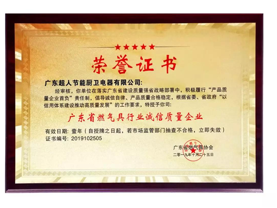 “廣東省燃氣具行業誠信質量企業”廣東省燃氣具協會根據廣東省委、省政府“以信用體系建設推動高質量發展”的工作要求,為獎勵超人在落實廣東省建設質量強省戰略部署中,積極履行“產品質量企業首負”責任制,倡導誠信自律、產品質量合格穩定,在近五年來國家質量抽查中未出現不合格、行業內信譽良好的企業。授予廣東超人節能廚衛電器有限公司“廣東省燃氣具行業誠信質量企業”榮譽稱號。