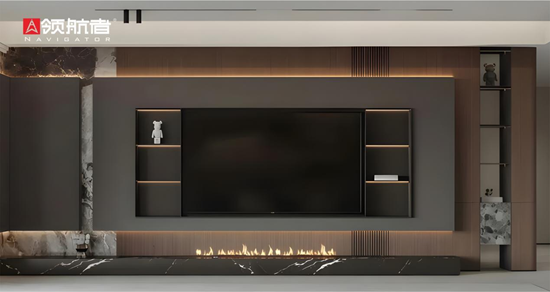 重構空間秩序,本質是對空間利用率與功能性的優化。領航者家居以用戶需求為導向,通過整家定制美學將“收納”與“美學”深度融合。聚焦小戶型空間痛點,設計團隊善用墻面垂直維度,打造頂天立地式柜體,搭配隱形門設計,讓收納空間隱于無形,既破解雜物堆積難題,又不擠占活動空間;針對大戶型,則通過分區定制的柜體與墻面造型劃分功能區域——如在客廳打造兼具展示與收納功能的電視背景墻,在玄關設計集換鞋、掛衣、儲物于一體的組合柜,讓每個空間各歸其位、秩序井然。