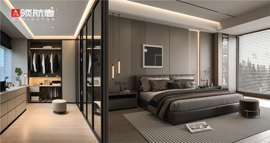 整家定制美學的核心,在于打破單品割裂的局限,實現空間的“形、色、質”統一。領航者家居深刻洞察到,家居空間的混亂往往源于風格不兼容、尺寸不匹配。為此,其門墻柜一體化方案從全屋整體規劃出發,將房門、背景墻、衣柜、玄關柜等家居單品納入統一設計體系。無論是極簡風的利落線條、輕奢風的精致細節,還是新中式的意境悠遠,都能通過統一的材質、色彩與設計語言,讓每個空間相互呼應,形成渾然一體的視覺效果,從根源上消解空間的碎片化感。
