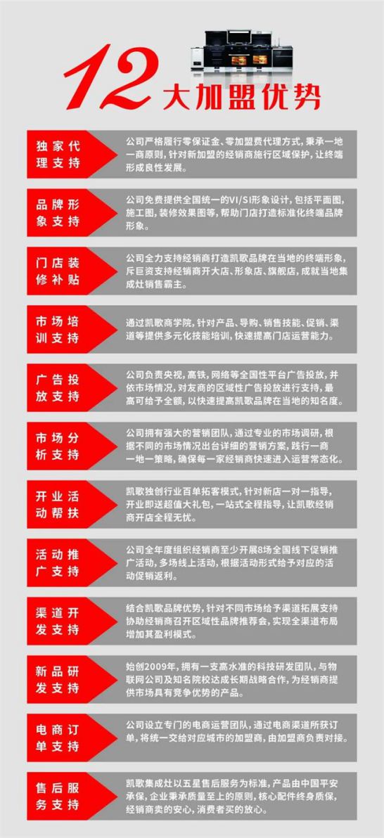 王總表示,凱歌集成灶擁有完善的終端運營體系,將實施精準(zhǔn)區(qū)域宣傳推廣、營銷后臺精細化管理、終端精細化運營、渠道拓展、免費客戶資源線上線下整合、千萬級精準(zhǔn)投放,多維度全媒體覆蓋,線上線下齊助力等,將對專賣店落成后一路跟蹤,手把手扶持,輕松經(jīng)營,穩(wěn)定贏利!