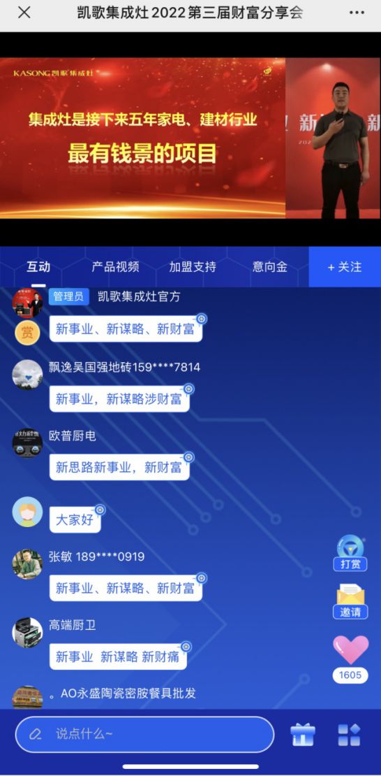 本次招商會,凱歌集成灶給予特別的限時優(yōu)惠政策,隨著王總宣布完本次招商會現(xiàn)場政策,直播間各位老板紛紛表達跟凱歌集成灶的合作意向。