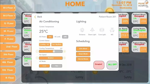 當房間太多區域太大,能源浪費又成為一個不可忽視的問題。針對公共建筑的這種情況,HDL也可以定制出相對應的解決方案。HDL的工程師在系統中安裝了感應模塊。當感應模塊檢測到病房中沒有人在的時候,系統就會自動把燈關掉。當房間里的溫度低于設定值時,系統會把空調的溫度調高,或者直接關閉空調,以減少不必要的能源消耗。據Prime Hospital管理團隊的反饋,在安裝了HDL的智能控制系統后,醫院的能源消耗和原來相比節省了近35%。
