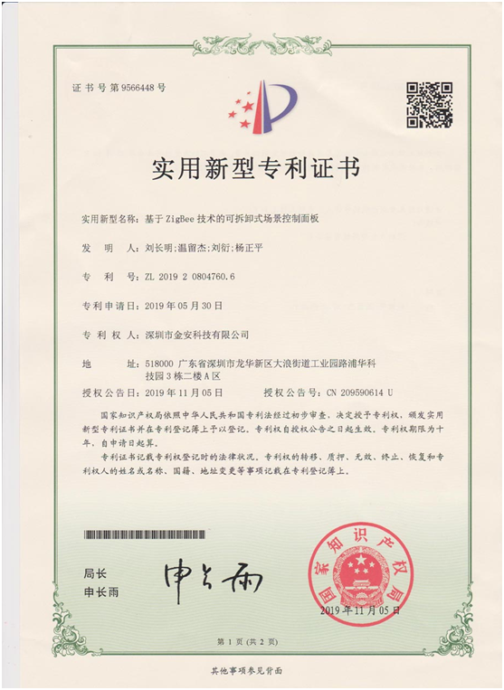 2、基于ZigBee技術的可拆卸式場景控制面板(專利證書號:第9566448號)